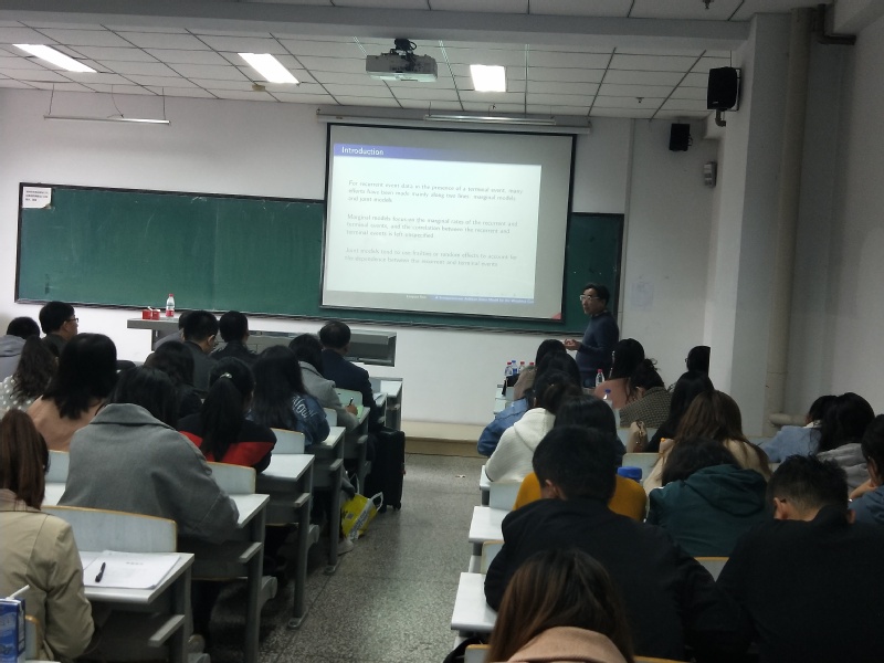 陈教授将自己的研究成果展示给大家,介绍了生存数据分析中的变异以及独立性的数据的筛选以及处理方式,其中包含的创新思维值得我们借鉴和学习,也引起了师生们的广泛讨论和积极提问。