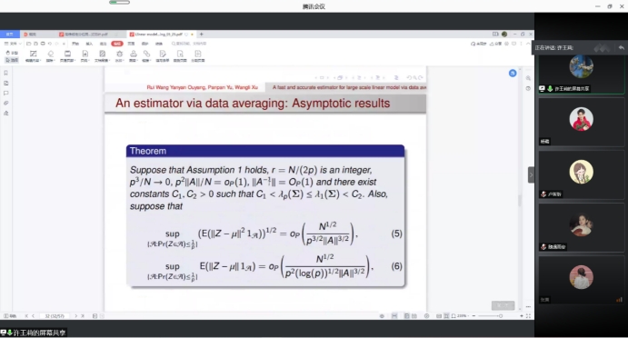 报告会中,中国人民大学统计系教授首先讲解了样本量极大且数据维数随样本量变化时线性模型的估计问题。许教授表示在这种情况下,基于完整数据的最小二乘估计在有限的计算资源下是不可行的。现有的许多方法都是基于概念性的。接着许教授展示了其推导的用于概念方法的条件均方误差的下界。然后,许教授向我们介绍了一种基于数据平均的采样方法,提供了一个可达到的最佳收敛速度。该方法将原始数据简化为几个平均观测值。这些平均观测值仍然满足线性模型,并用于估计回归系数。最后研究了所提出的估计方法的渐近性。使大家对于数据平均的采样方法的高效性有了更加深入的了解和兴趣。