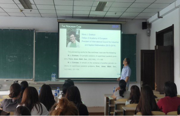 报告会中,尹景学教授先向大家讲解了动力学方程,进一步向大家展示了线性和非线性扩散的Lane-Emden热流。最后探讨了其解的动力学行为,包括解的周期性、渐近性的复杂性和解的混沌性等。使大家对于线性和非线性扩散的Lane-Emden热流的动力学行为有了更加深入的了解和兴趣。