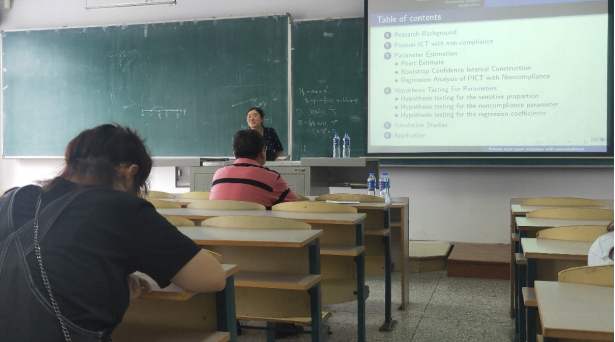 报告会中,吴琴博士首先讲解了众所周知的项目计数技术(ICT)及其应用背景,进一步表明该技术将已知比例的独立无害问题列表替换为单个无害计数问题,同时引出项目计数技术(ICT)的天花板和地板效应的缺点。但是,仍存在无论是否存在“不真实”的假设,受访者都会给出“不真实”答案的情况。随后,吴琴博士又向大家教授了解决回答者自我保护行为的问题并提供更可靠的分析模型的定义即泊松项目计数技术。进一步向大家展示了模型的矩估计,极大似然估计以及模型参数问题的解决。最后,吴琴博士向大家了介绍了其仿真研究的结果,可以看出当数据量足够大时该方法的性能很好。并通过一个汽车保险欺诈的实例形象地向大家展示PICT方法。实证使大家对于PICT方法有了更加深入的了解和兴趣。