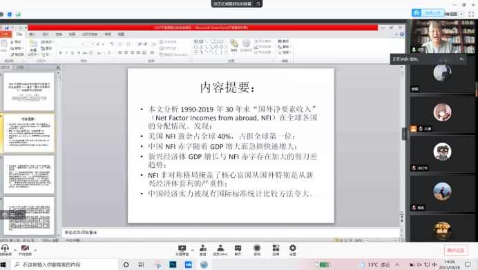 报告会中,邱东教授讲解了1990-2019年30年来“国外净要素收入”在全球各国的分配情况,并进一步说明了美国的NFI盈余占全球40%,占据全球第一,中国的NFI赤字随着GDP增大而急剧快速增大。最后邱老师还讲授了新兴经济体GDP增长与NFI赤字存在加大的剪刀差趋势。