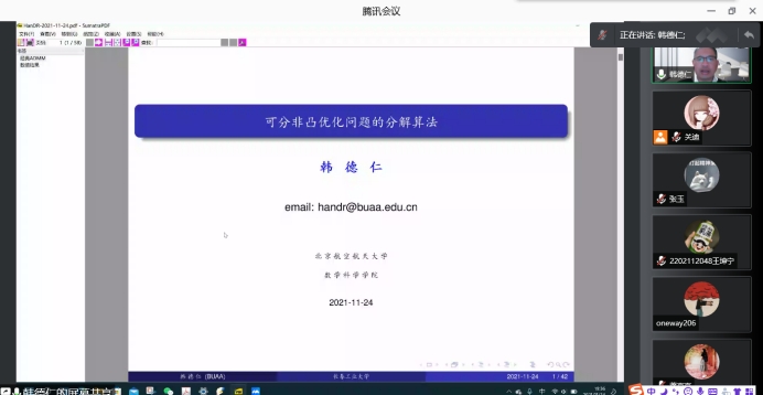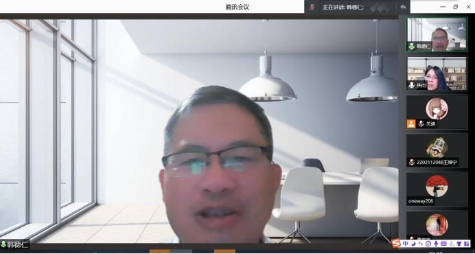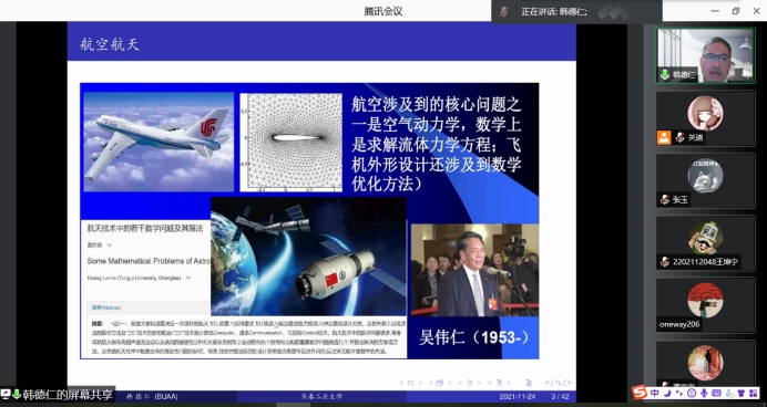 2021年11月24日下午19:30我院特邀北京航空航天大学韩德仁教授做线上学术报告,报告由学院院长王纯杰老师主持,学院部分老师、全体研究生参加了本次线上学术报告会。