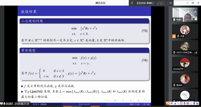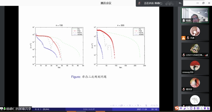 报告会中,韩德仁教授通过牛顿万有引力的例子,引出世间万事万物都是优化的过程,例如航空涉及到的核心问题之一就是数学优化问题。韩教授由浅入深地从线性规划的发展出发,总结了机器学习、人工智能中非凸优化问题的特性,并对神经网络的原理进行了阐释,指出实际应用中的一些优化问题的难点在于规模大、非光滑,并且单个函数优化容易处理而合在一起难处理。随后,将KL指数作为优化指标,韩教授进一步介绍了DR分裂算法等三类可分非凸优化问题的分解算法。