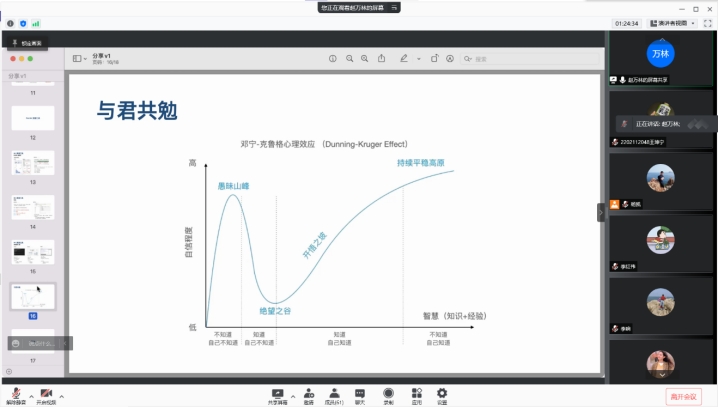 报告会中,赵万林老师从以下几个部分分享了互联网数据分析相关的工作内容,以及实际工作中常用分析方法、常用工具使用和大数据中实验流程,为师生们做了一场精彩的学术报告。分别从什么是数据分析;数据分析中的常用方法;数据类型等方面讲述了数据分析的相关知识。通过“无法衡量,便无法增长”,“如果你问我哪个方面用不到统计学,我还真说不出来”引出了统计学的重要性。分别讲解了数据分析常用技术方法:聚类分析、因子分析、相关分析、回归分析、方差分析等方法;业务常用数据分析方法:多维分析、漏斗分析、链路分析、留存分析等方法。赵万林老师还介绍了实验设计的基本思路。最后与我们分享了邓宁-克鲁格心理效应,能力欠缺的人有一种虚幻的自我优越感,错误地认为自己比真实情况更加优秀,这需要我们加强学习,对自己有更加清晰的认知。