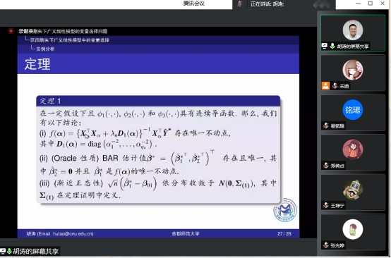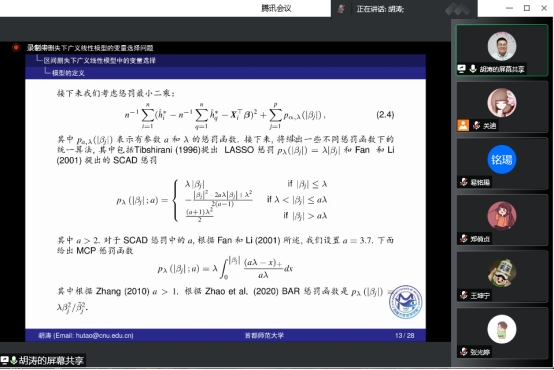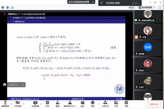 报告会上,胡涛教授首先介绍了生存分析数据的应用背景,通过尼日利亚儿童死亡率案例详细阐述了区间删失下广义线性模型的变量选择方法、理论、算法及应用,最后介绍了此领域相关重要文献和有待进一步深入研究的问题。