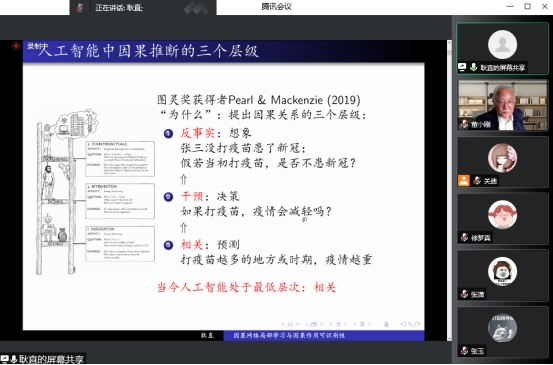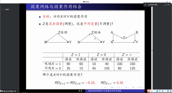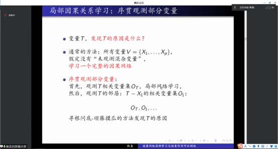 图灵奖获得者Pearl提出因果关系的三个层级:相关与预测、干预与决策、反事实与想象。报告会中,耿直教授带领我们一起探讨第二和三层级的因果挑战问题。因果推断旨在利用试验性研究和观察性研究的数据,评价变量之间的因果作用以及识别因果网络的结构。为了评价原因变量X对结果变量Y的因果作用,需要判断哪些变量是混杂因素、哪些变量是中间变量。为此,我们提出将因果关系网络局部学习与因果作用评价相结合的方法。首先学习X和Y的局部因果网络,据此判断各种混杂因素和中间变量的组合,然后确定X对Y可能的总因果作用和直接因果作用。
