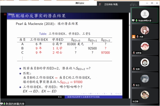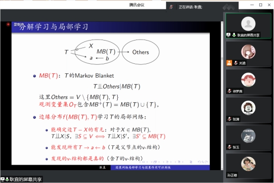 会后,耿直教授与参会师生进行互动,气氛活跃,热情高涨。本次线上报告会有助于全体数统学院师生深入了解“局部因果网络”相关内容,讨论有关于识别“混杂因素”和“中间变量”的相关问题。此次专题讲座内容丰富,拓宽视野,培养经济学基础深厚、创新能力突出、引领文明进步的数学与统计领军人才和未来大师。