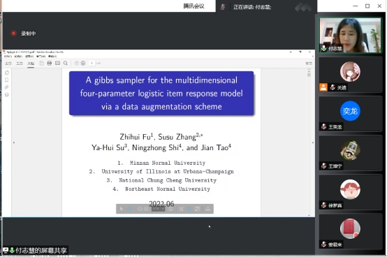 在报告中,付志慧教授详细介绍了针对多维4PL模型提出的基于数据扩充的Gibbs抽样法,该算法简单高效。除了上、下渐近线参数以外,其余参数的满条件分布都是相应参数先验分布的截断,因此,不需要考虑先验分布的共轭性。最后,通过模拟研究将所提方法与R包“MIRT”及“OpenBugs”的估计结果进行了分析比较,并使用4PL模型分析了一个经验数据集,模型选择指标显示4PL模型要优于3PL和2PL模型。