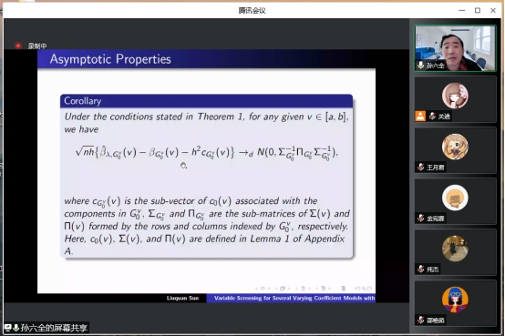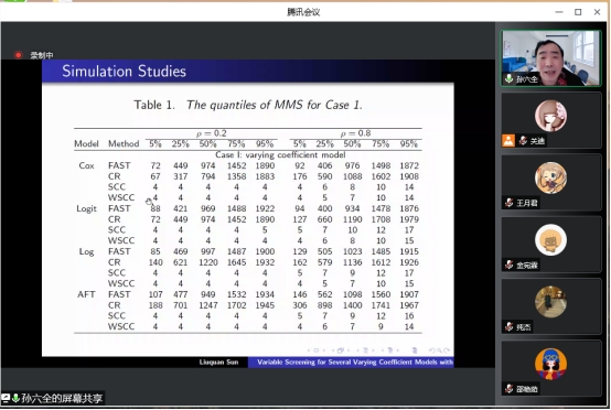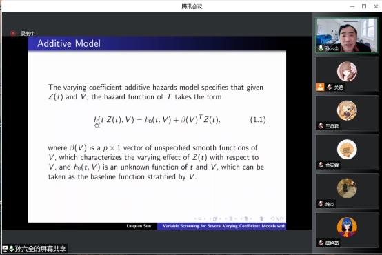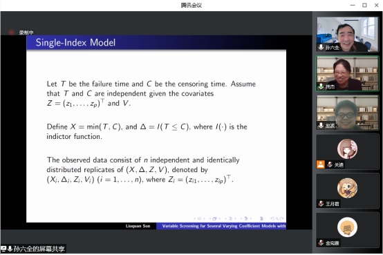 本次报告会的主题是“基于超高维生存数据的变系数模型的变量筛选”,报告会伊始,孙六全老师针对变系数加性风险模型,提出了一种有效的剔除不重要变量和识别重要变量零子区域的方法。在此基础上,孙老师阐述了一种基于核平滑和分组学习的变系数Cox模型非边缘变量筛选方法。最后,针对单指数形式的变系数灾害模型,提出了一种生存型条件相关方法并讲解了真实的数据例子。