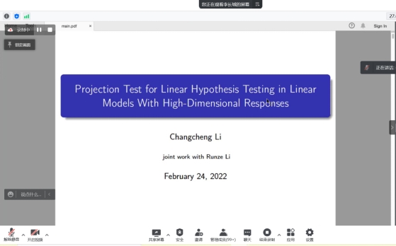 检验在高维情况下的不适用性。随后,李长城教授着重介绍了投影检验的想法,其思想是将高维数据投影到低维空间中,再利用经典的检验方法进行检验,并指出问题的关键就是寻找投影矩阵,而以往随机生成的投影矩阵会带来一些问题。李长城教授在最优投影检验的基础上提出了U投影检验方法,推导了U投影检验的性质,通过数值模拟以及实例说明新方法的优势,讲解方式深入浅出,不仅让师生收获颇多,也激发了同学们对此研究方向浓厚的学习兴趣。