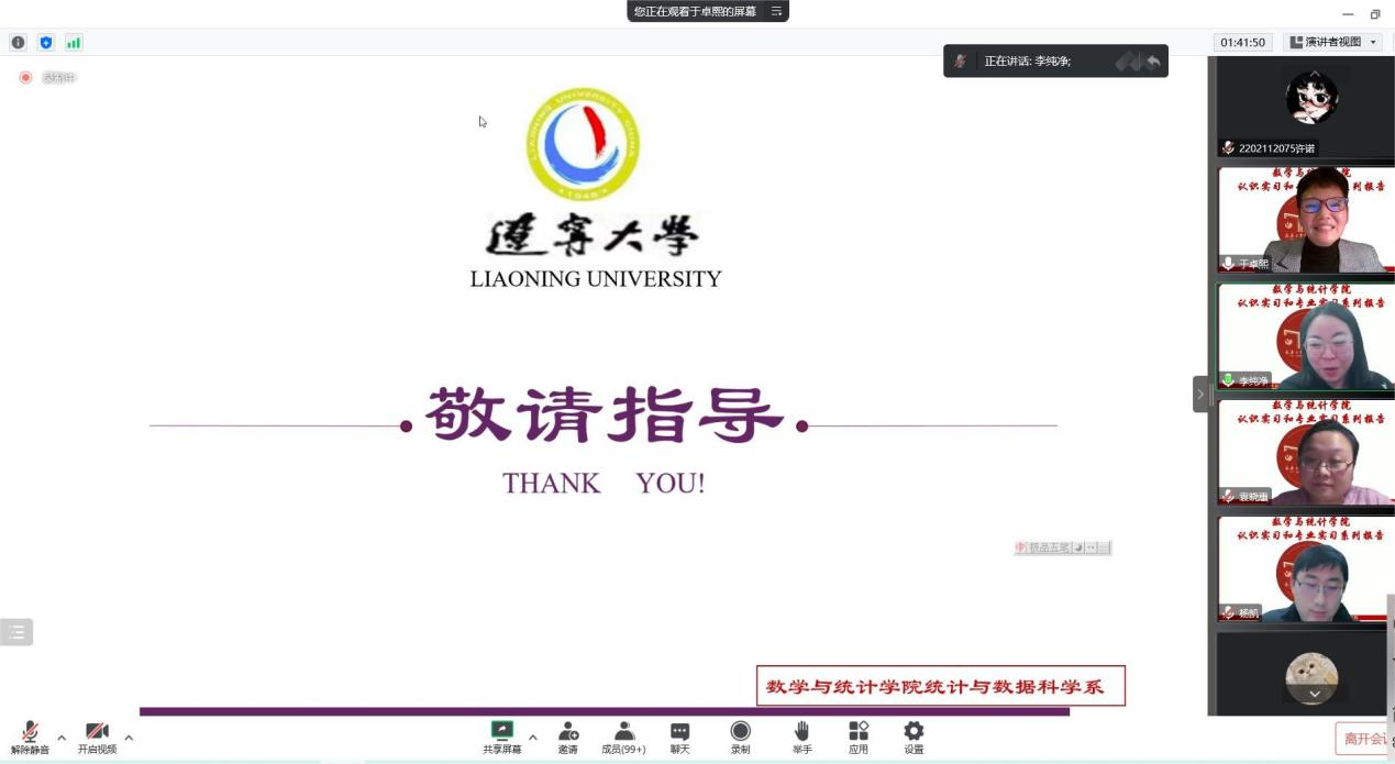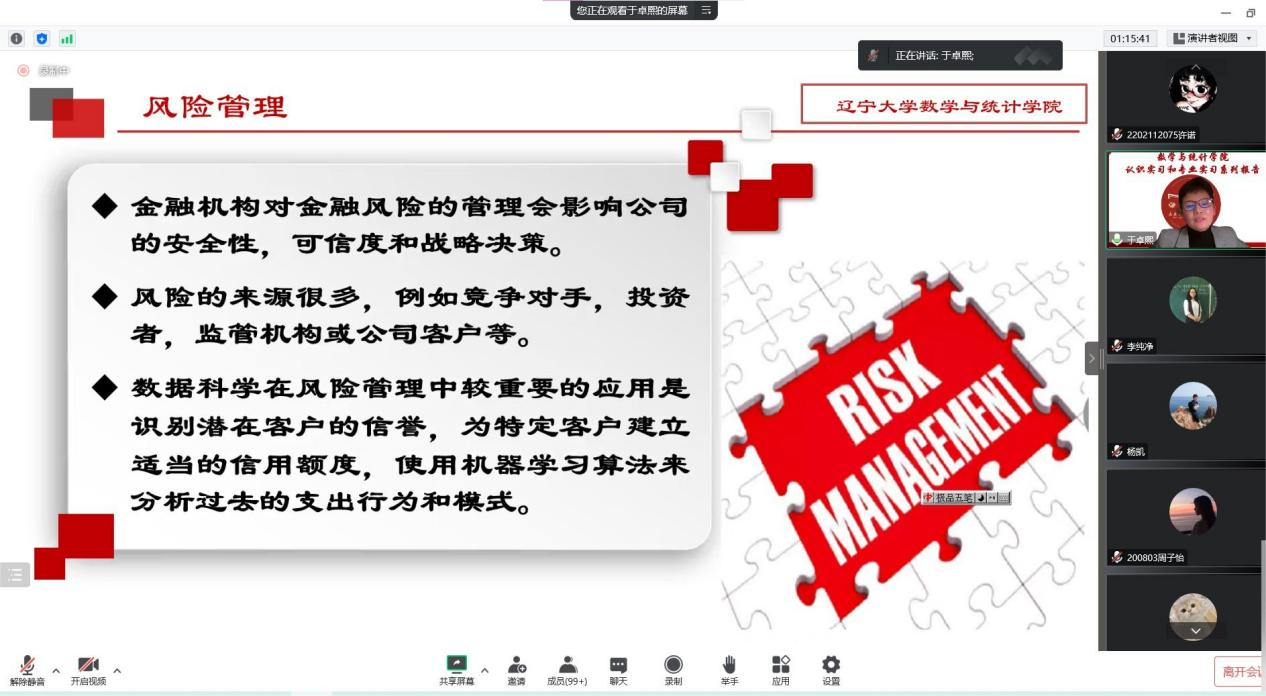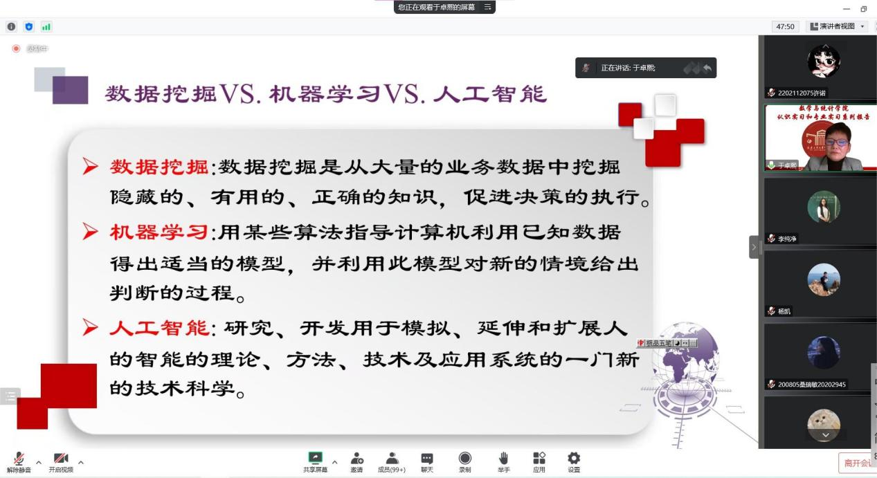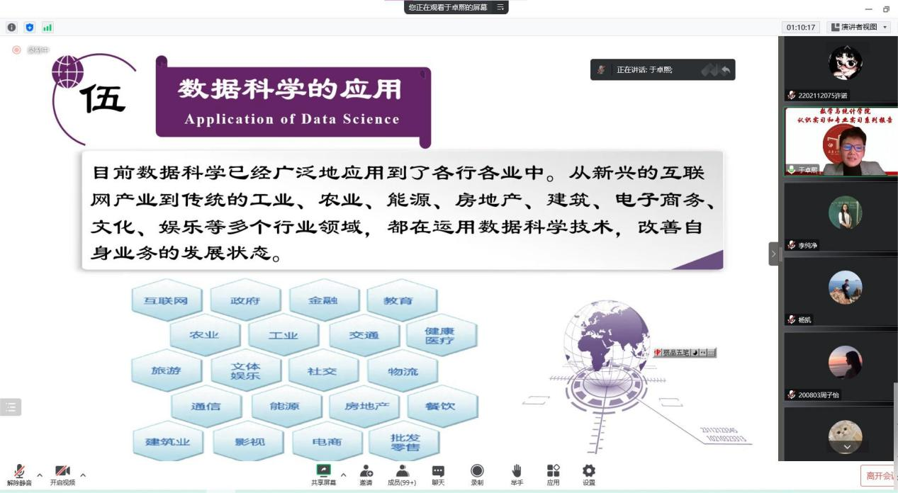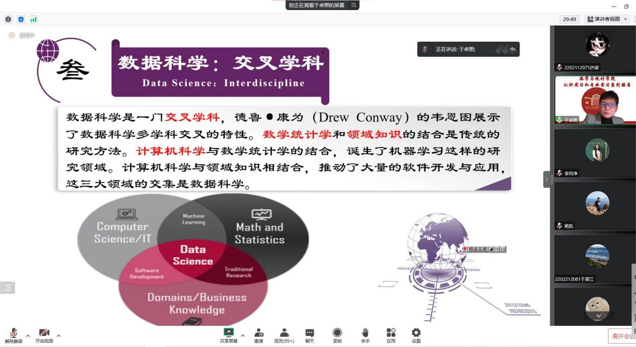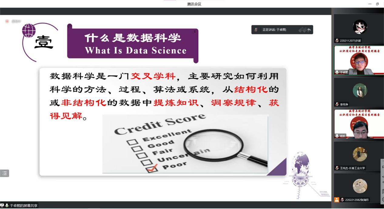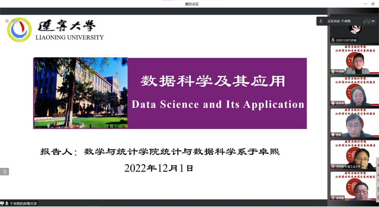 (通讯员:杨凯)2022年12月3日下午19:00,我院特邀辽宁大学于卓熙做题为《数据科学及其应用》的报告。本次报告由学院副院长李纯净主持,学院院长王纯杰、统计系主任杨凯、统计系党支部书记袁晓惠、2020级、2019级本科以及部分研究生参加了本次线上报告。