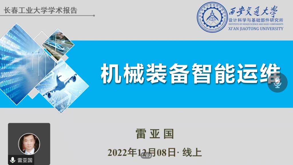 (通讯员:关迪)为丰富学生的学习生活,提高学生的综合能力,2022年12月8日下午19:30,由科研处和澳门网投官方网站承办的“机械装备智能运维”在腾讯会议线上举行,特邀西安交通大学雷亚国教授做报告,为澳门网投官网师生进行讲解,澳门网投官方网站院长王纯杰、副院长李纯净、统计系主任杨凯、学院部分老师,本科及研究生共215人参加本次线上学术报告,报告由院长王纯杰主持。