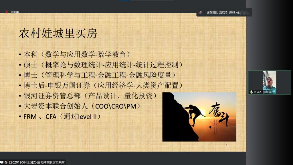 主讲人简介:大岩资本创始合伙人。北京工业大学管理科学与工程博士、概率论与数理统计硕士;上海社会科学院经济学博士后、荷兰蒂尔堡大学公派留学访问学者、香港科技大学访问学者,FRM。2008年至2010年,在申银万国证券任职,主要从事资产配置、风险管理和量化投资策略博士后研究。2010年至2012年,在中国银河证券资产管理总部任职,主要从事量化投资策略研究、产品设计等工作。2013年,作为联合创始人创立大岩资本,并担任首席风险官、投资经理等职位。