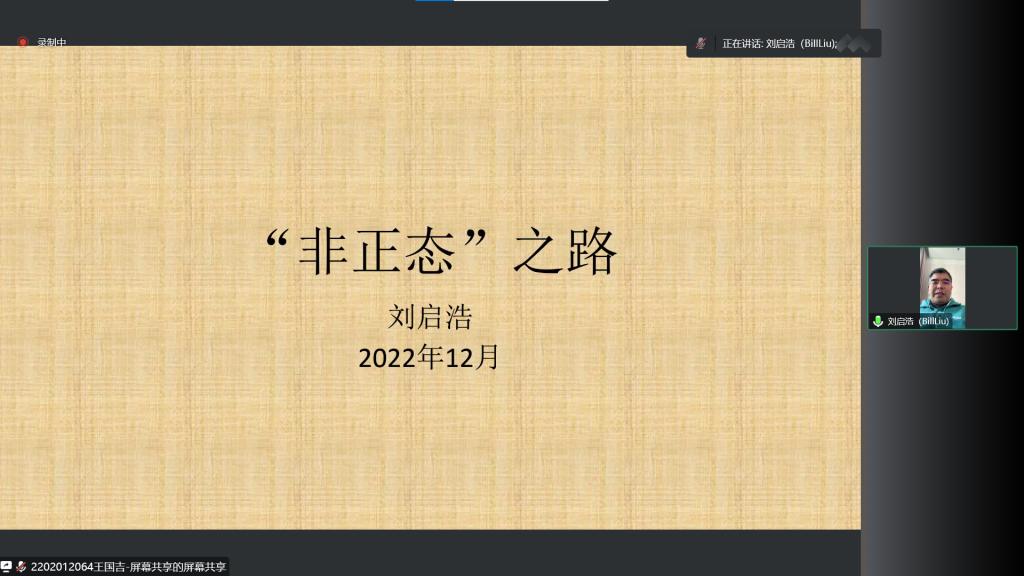 (通讯员:关迪)为了扩展学生的专业思维,提升专业知识的理论学习水平,2022年12月30日下午13:30,由科研处和澳门网投官方网站主办的报告——“非正态之路”在腾讯会议线上举行,特别邀请刘启浩博士作为主讲人,基于刘博士本人的研究以及工作经历,为澳门网投官网师生进行讲解,我院共有160多名师生前来参会讨论与学习。我院澳门网投官方网站院长王纯杰、副院长李纯净等均参与会议讨论,会议院长王纯杰主持。