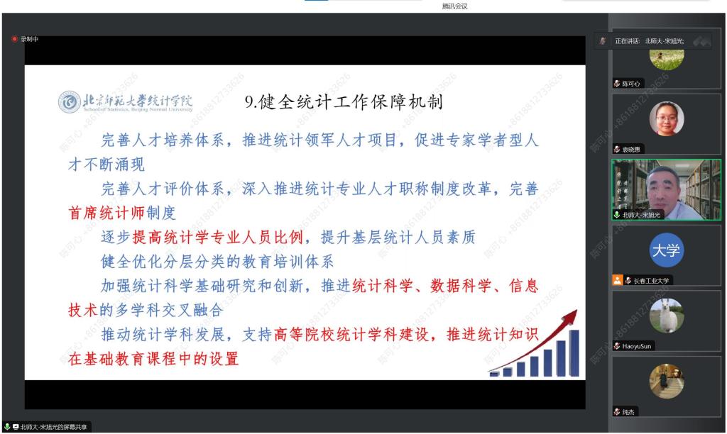 此外,在接下来的讲解中,宋旭光教授为学院师生介绍了统计现代化改革的各个方面,主要包括统计指标体系,统计调查制度体系,国民经济核算体系,统计监测体系,统计监督体系,统计信息化建设,统计工作保障机制等方面。在统计体系建设方面,统计部门与其他政府部门之间要紧密联系,相互交流,防止数据孤岛问题,同时要更新数据收集体系,实现统计数据报采集处理的全面在线化;在行政监督方面,要严格贯彻中央《防范和惩治统计造假、弄虚作假督查工作规定》,执行好统计督察工作,保证数据质量。