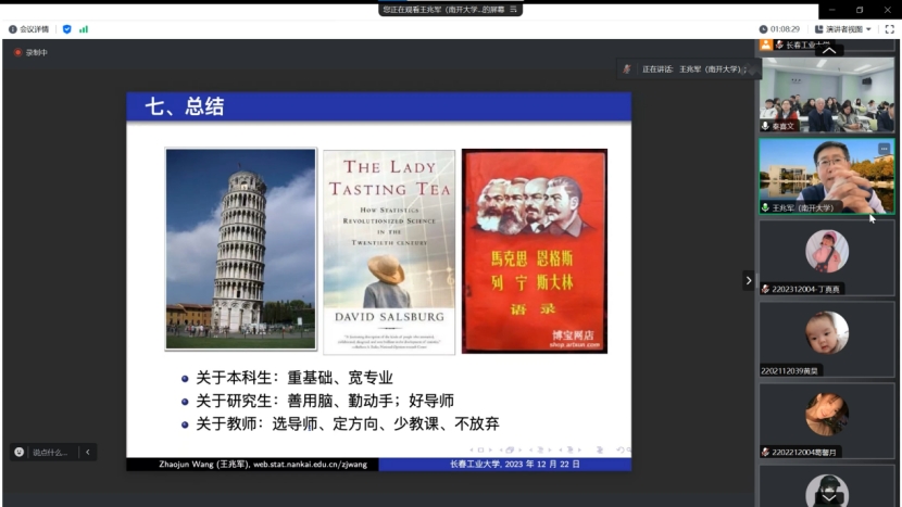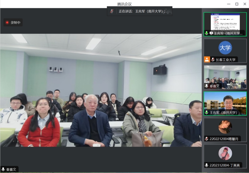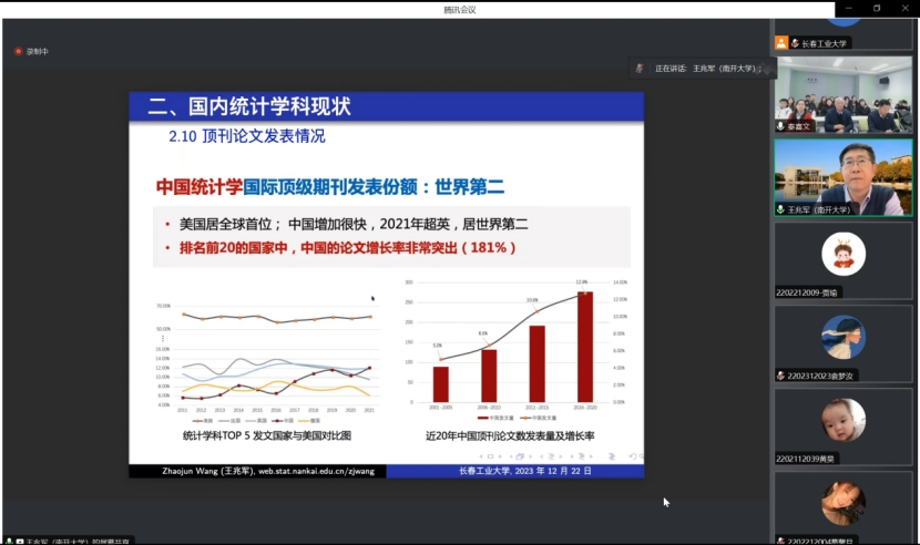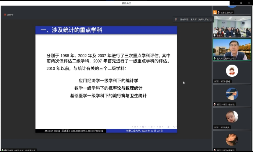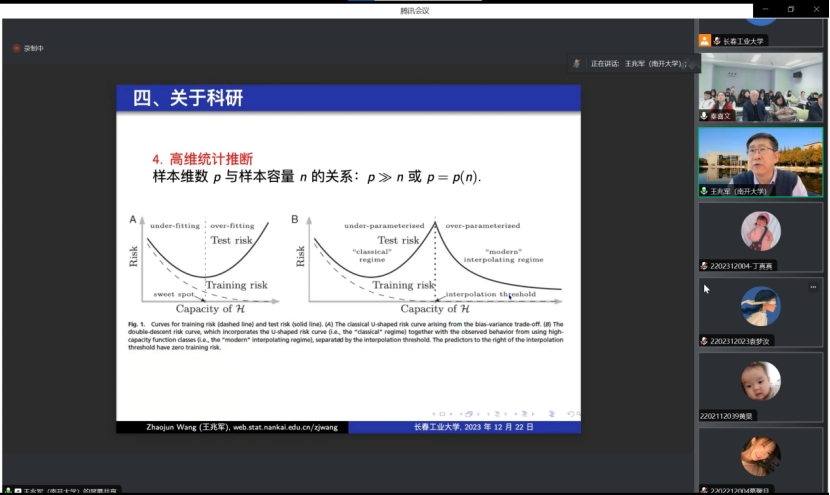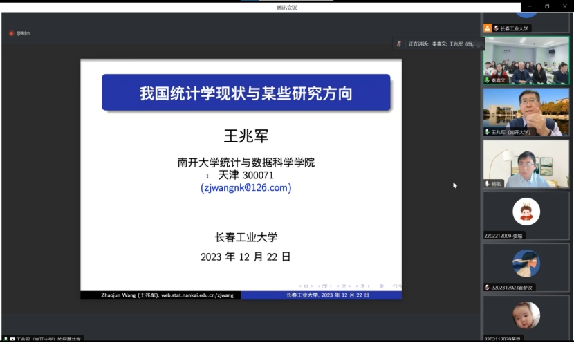 (通讯员:关迪)2023年12月22日9:00 ,南开大学王兆军教授为我院做线上学术报告,学校副校长林洁琼教授、校学术委员会副主任董小刚教授、澳门网投官方网站院长王纯杰教授、澳门网投官方网站副院长李纯净副教授、澳门网投官方网站副院长杨凯副教授、澳门网投官方网站统计系主任王淑影副教授以及学院部分老师、研究生参加了本次线上学术报告会。会议由大数据科学研究院院长兼学科建设办公室副主任秦喜文教授主持。