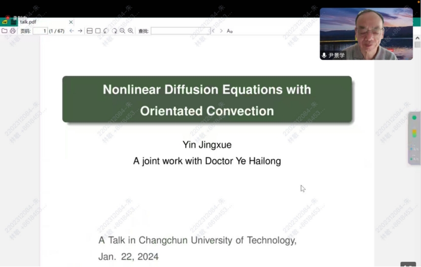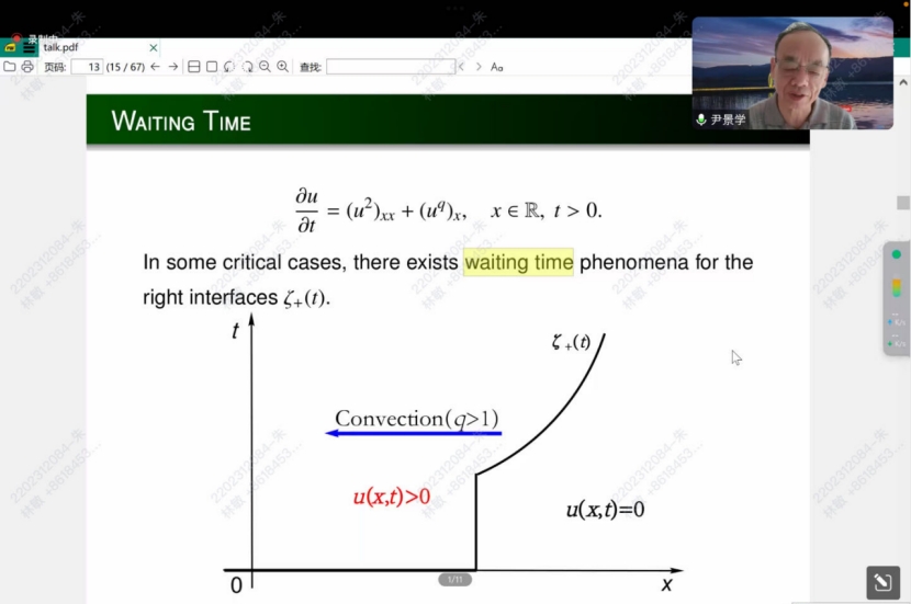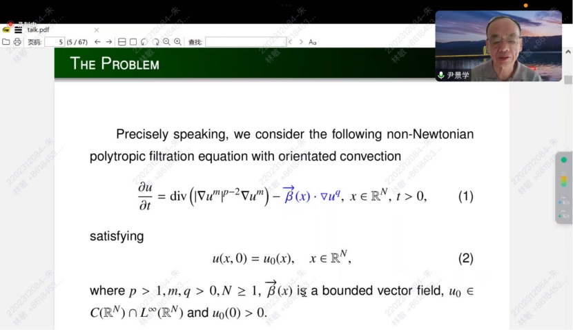 尹教授的报告方式严谨而深入,生动且形象,在汇报中的深刻的见解和清晰的逻辑也使老师和同学们对定向对流的非线性扩散方程有了更深层次的理解。汇报结束后,对于学生反馈的问题方面尹教授也展现了卓越的教学水平,对学生的关切和理解令人感慨。此次报告会给学生们带来深刻启迪,为学生未来学习提供了宝贵的指引和启发。