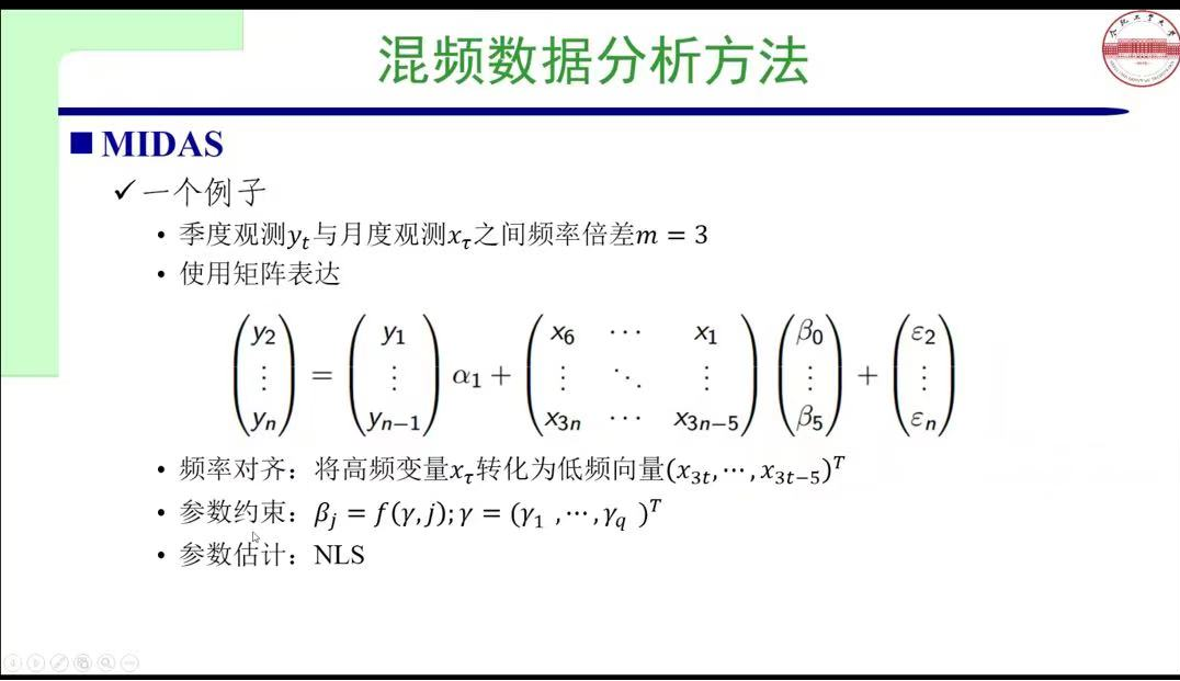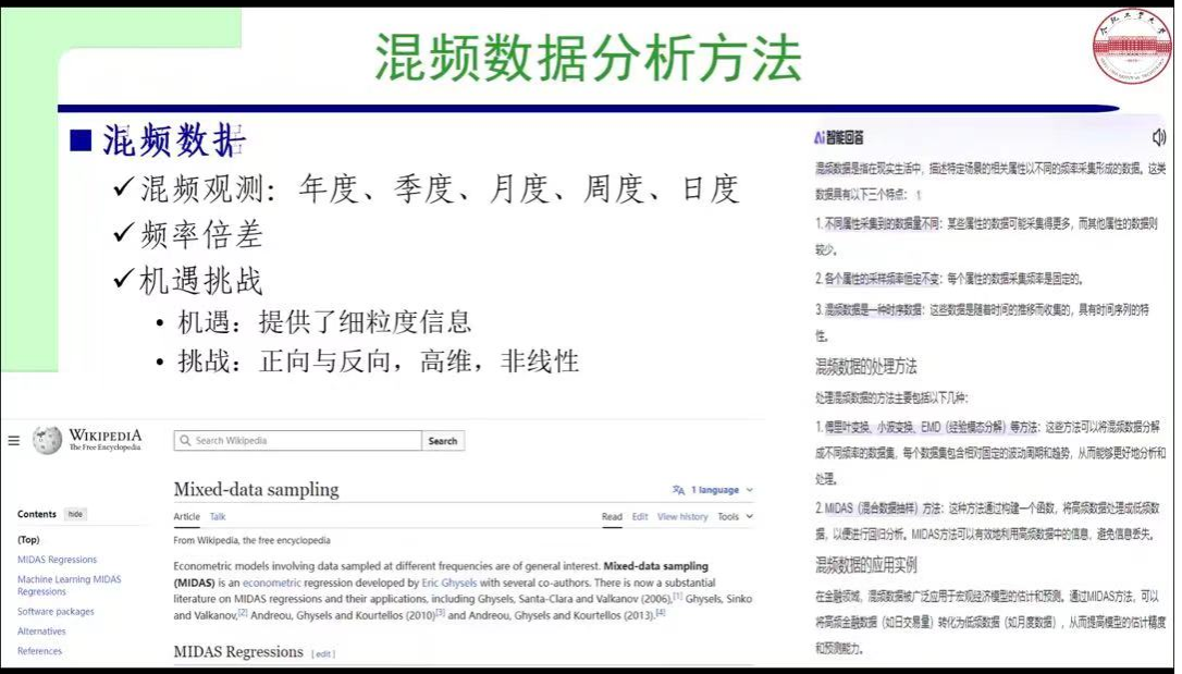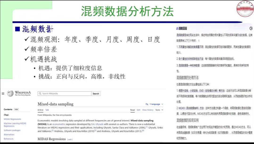 同时许教授还介绍了混频数据分析方法的流程。混频数据分析方法的处理方法包括传统的同频化混频抽样,如 Ghysels 等(2004,2007)提出的 MIDAS,以及刘汉与刘金全(2011)的实时预报,其理论基础是分布滞后模型。基本步骤有频率对齐、采用多项式权重函数约束状态空间模型,像 Liu 和 Hall(2003)提出的状态空间模型,其核心思想是将低频数据视为有缺失的潜在高频数据,估计方法包括卡尔曼滤波向量自回归。此外,还有 Zadrozny(1988)参数驱动的 MF - VAR 模型(类似状态空间模型)以及 Ghysels(2016)数据驱动的 MF - VAR 模型(类似 MIDAS 模型)。在后续报告中,许老师详细讲解了如何运用混频数据分析方法,即通过矩阵表达、频率对齐、参数约束和参数估计等步骤进行运算,同时讲述了混频数据的机器学习研究背景与模型建立情况。