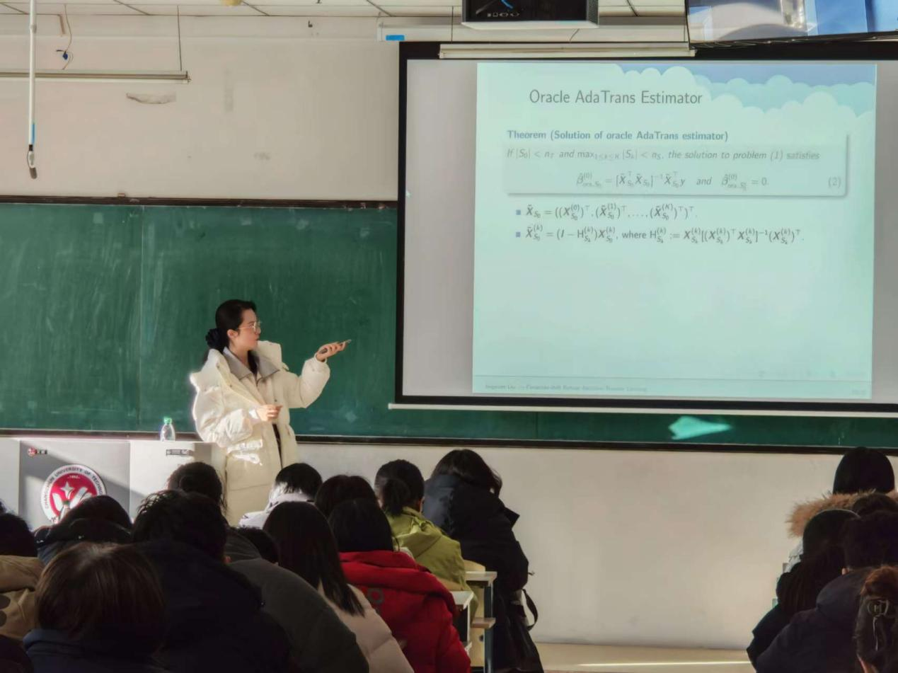 在接下来的报告中,刘教授讲述了从迁移学习中的基本概念和问题出发,引出研究的背景和动机,强调处理协变量偏移和探索特征可迁移结构的重要性;并详细阐述为解决在高维回归设定下应对存在协变量偏移时的模型偏移问题所提出的方法(自适应迁移学习),包括 TransFusion、D - TransFusion 和 AdaTrans 的具体原理、步骤及理论依据,逐步深入分析如何实现对高维协变量偏移的稳健性和对可迁移结构的自适应处理。
