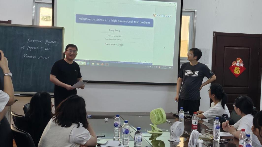 在题为"基于自适应L-statistics的高维均值检验"的学术报告中,冯龙教授向在场师生展示了他的最新研究成果。报告厅内座无虚席,有众多教师学者前来聆听,也吸引了大量对高维统计充满热情的学生。教授深入浅出地讲解了如何通过创新的L统计量方法解决高维数据检验难题,案例分析生动且逻辑推导清晰。
