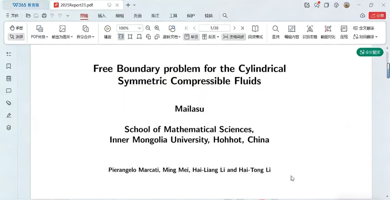 其次,麦教授对阻尼系统的背景解寻找方法进行了解释:纯欧拉系统可通过变换得到,而带有阻尼的系统则具有明确的背景解结构。同时,麦教授也介绍了团队目前正在研究的问题:从一维、球对称、γ=2的情况扩展至一维、球对称、任意γ>1的一般情况。此外,涵盖了无阻尼的相对论欧拉方程以及带阻尼的欧拉-Poisson方程等模型。
