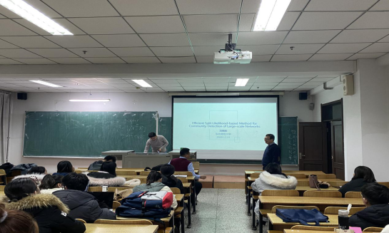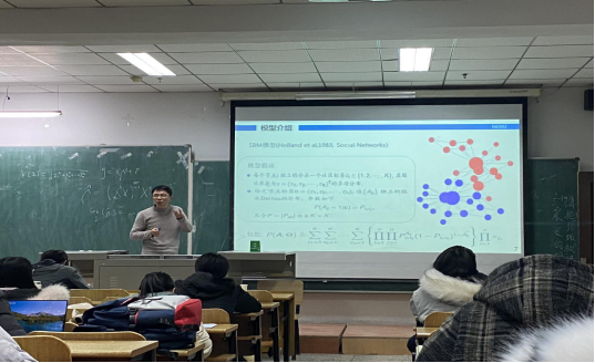 报告会中,刘秉辉教授介绍基于分割似然的大规模网络社区检测方法的应用开始介绍,共同探讨哪些模型比较有用又是生活中的长期研究的热点问题。通过报告全局性地介绍了统计学中常见的大规模网络社区及其模型,以及SBM模型建设和算法构建及其收敛性的相关内容。使大家对大规模网络社区检测方法产生了浓厚兴趣。