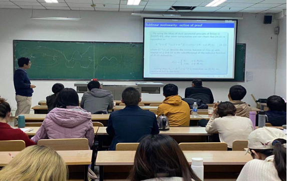 在接下来的报告中,冀书关教授以“ 非线性的周期解”为主题,用通俗易懂的语言讲述了以线性为起点,从新的角度认识非线性的周期解,将非线性的周期解与别的知识相结合,提出新的具有建设性开创性的观点。整场报告深入浅出、旁征博引,引起了与会师生们的热烈反响。介绍了具有一系列相关系数的波动方程,用通俗易懂的语言展示了方程背景下数学的魅力所在,将自己的亲身经历和人生感悟分享给与会人员。