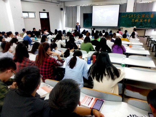 报告会开始,赵丹经理向大家介绍了大数据的时代下数据在统计学,生命科学,人工智能等多方面的重要性。从而引出处理分析大数据最权威的软件——SAS。接着向大家简单介绍了SAS公司,以及公司的荣誉、SAS各个产品的特性及其应用方向。随后,赵丹经理着重强调了SAS比赛对同学们学习的意义。赵丹经理用图片带领同学们回顾了SAS比赛的发展过程及历年比赛情况及比赛报名方式,比赛的各个阶段流程,评判标准,比赛的奖励及比赛结果的告知方式,鼓励同学们积极参加此次比赛。会后,同学们积极提出问题,赵丹经理详细地为大家一一解答。