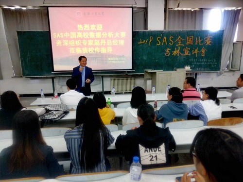 澳门网投官方网站团委讯(通讯员:李龙章 桂尚珂)为了让统计学的同学们深入了解SAS软件在学习与日后工作中的重要性,让同学们积极参加接下来的“扬子江新金融杯”2019 SAS (中国)高校数据分析大赛暨首届国际邀请赛,2019年9月27日,澳门网投官方网站荣邀SAS中国高校数据分析大赛资深组织专家赵丹总经理及其团队莅临我院,并于下午13点,在教图楼701教室做2019SAS全国比赛吉林宣讲会。澳门网投官方网站党委书记朱宏伟、副院长徐平峰、统计系主任李纯净、部分教师代表及统计学专业的硕士研究生和本科生参加了此次宣讲会,会议由学院党委书记朱宏伟主持。