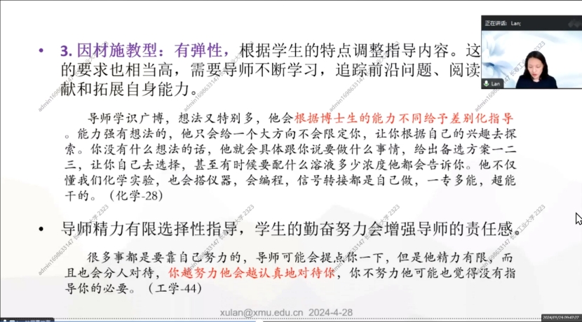 6. 因材施教型:有弹性,根据学生的特点调整指导内容。这个要求也相当高,需要导师不断学习,追踪前沿问题、阅读文献和拓展自身能力。