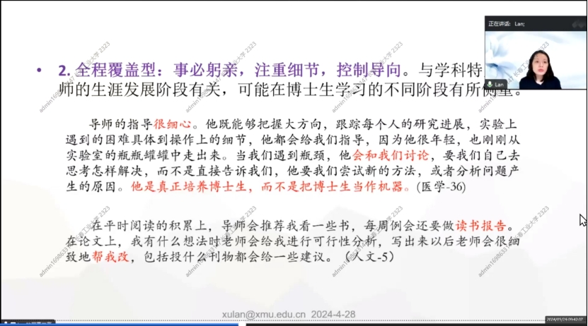 5. 全程覆盖型:事必躬亲,注重细节,控制导向。与学科特色导师的生涯发展阶段有关,可能在博士生学习的不同阶段有所侧重。