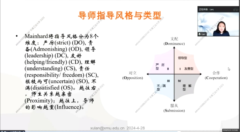 以双向交流为特征,导师对学生以接纳式反应为主,给学生以足够的自由度,但同时又把握方向给予细致的指导。其特点是导师以学生为中心,低控制高指导,较为注重因材施教。年轻的导师,有境外尤其是北美留学经历的导师比较容易形成平等型的指导风格。