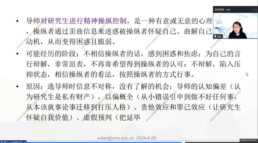 主要是因为科研评价体制导致的利益冲突。导师的任务是拉项目养实验室,角色是科研包工头,研究生的角色则是为老板打工认为导师对其存在一定程度的剥削控制的关系。导师控制着学生能否毕业的生杀大权,因此在导师要求学生做事的时候不能讨价还价,要定位好自己的角色。有时候学生认为导师比老板好一些,但师生之间有着天然的差距,是注定做不了朋友的