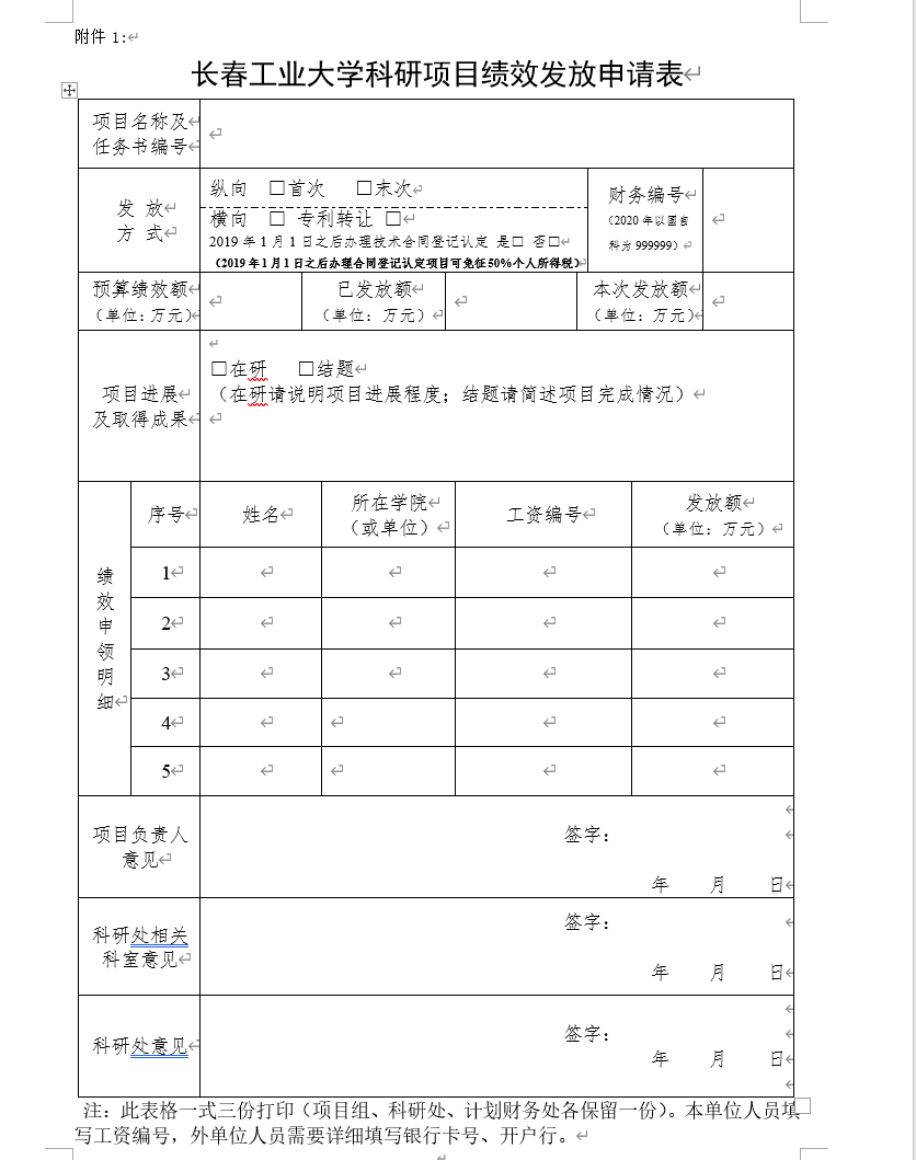 三、携带“绩效发放申请表①(一式三份)”、项目任务书(合同书)复印件②(横向项目需另附合同经费预算书③验收证明④),到科研处相关科室办理登记认定。注:依据管理办法,绩效申领发放只面向项目组成员(含外单位成员),横向科研项目绩效申领仅面向企业结题验收的项目。